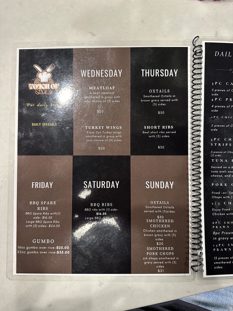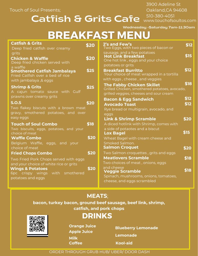 Touch of Soul, a Black-owned comfort food restaurant in Emeryville, CA, offers a soulful breakfast and brunch menu filled with classic dishes like Catfish & Grits, Chicken & Waffles, and Smothered Catfish Jambalaya. The restaurant provides a range of breakfast options, from hearty combos to flavorful scrambles. Customers rave about the delicious food, with one mentioning their love for the ox tails and another praising the light cornmeal batter used in the fried seafood. The spacious outdoor seating area adds to the dining experience, providing a charming ambiance. With its friendly service and delectable offerings, Touch of Soul is a must-visit destination for those craving authentic soul food.