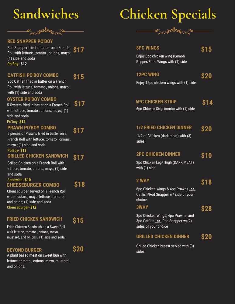 3 pieces of catfish fried in batter on a French roll with lettuce, tomato, onions, mayo. Served with side and drink.
