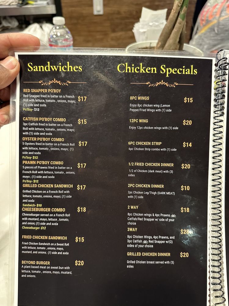 Red snapper fried in batter on a French roll with lettuce, tomato, onions, mayo. Served with side and drink.